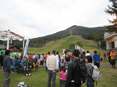 さてさて、受付・スタート会場にやってきました。『Madarao Forest Trails 50km』に出場する皆さん、ここが、スタート&ゴール地点ですよ~!あの斜面を駆け下りて笑顔でゴールしましょう!!