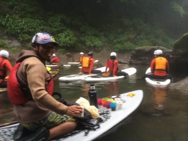 この前リバーSUPの世界大会で3位になったYacuインストラクターから説明を受けます。
