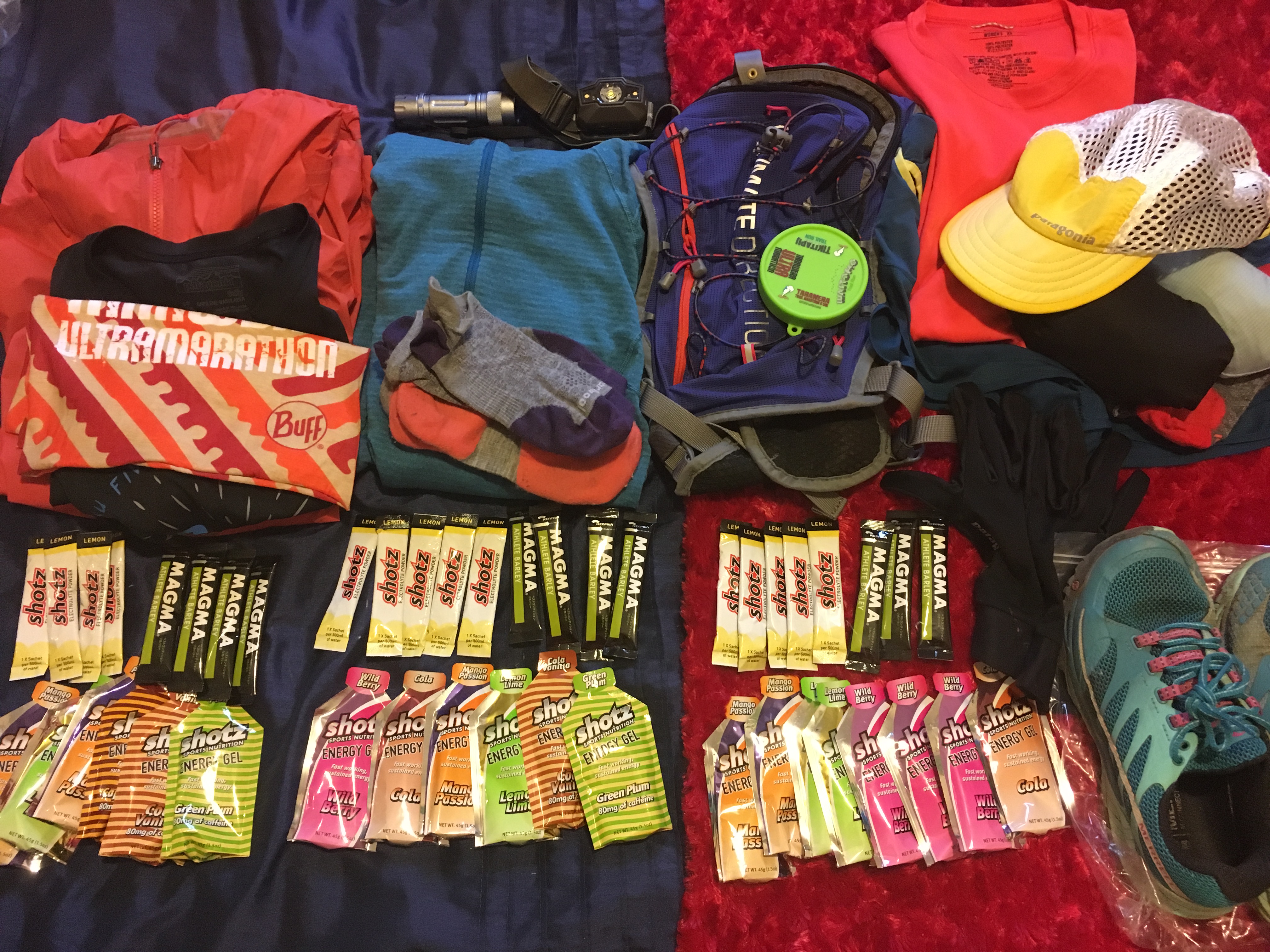 Shotz20個、Shotzエレクトロライトパウダー14個、Magma、Myカップ、ヘッデン&予備電池にGarmin(腕時計)用の充電池、水は1、3リットルetc。