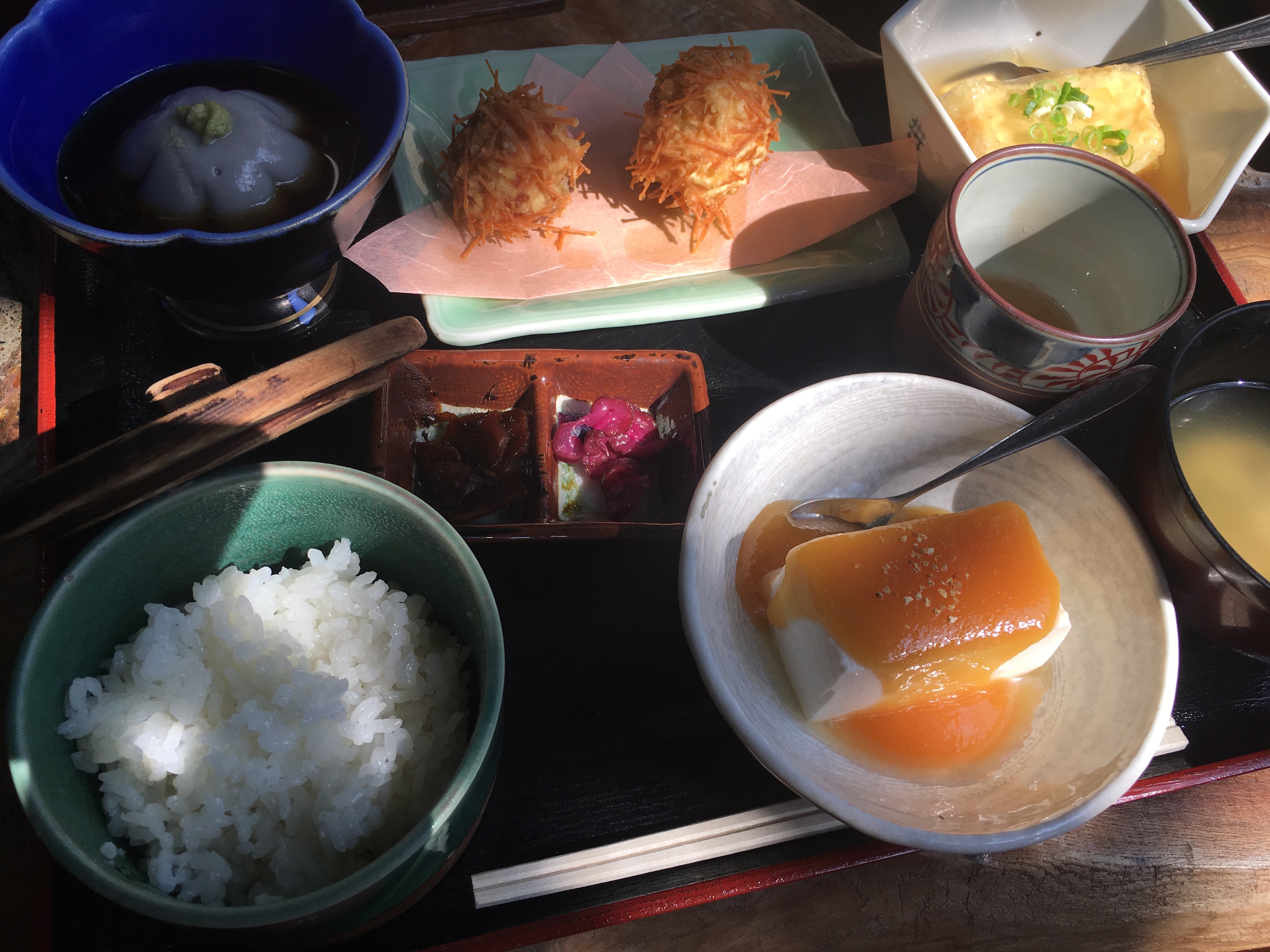 山頂から続く長い階段を下り、最後は大山ケーブル駅付近の豆腐定食屋で昼食です。