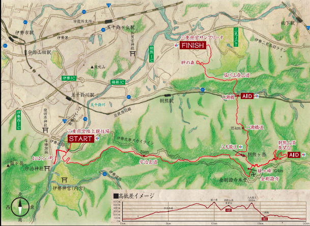 トラックを抜けておはらい町を駆け抜け、トレイルに入ります。 コースを見てわかる通り、前半の10kmはほとんど登りで後半の10kmは下り基調のコース。