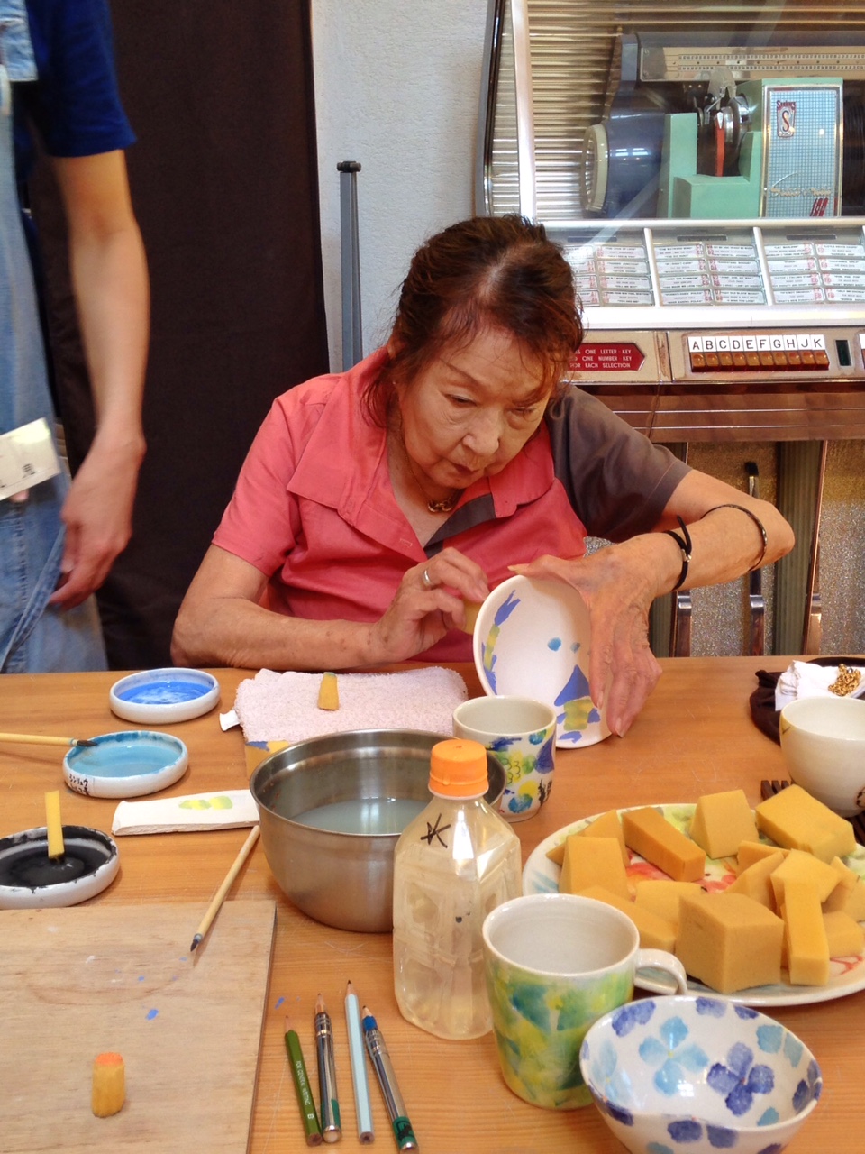 色・形様々なスポンジを使って、お好みで選んだ器を好みに色付けます♪